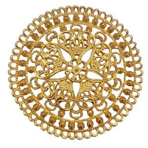 This stunning well-crafted designer-style Gold Tone Round Heart Medallion Etruscan Statement Brooch features a round interlace design heart pattern slightly domed medallion shaped in radiant gold tone. This statement pin measures approximately 2.8 inches in diameter. Although this piece is not marked or signed, its appearance shows great craftsmanship compared with mid-century Designer-style costume jewelry. The back of this statement brooch has a locking pin which is sturdy and secure, allowing the piece to be easily attached to clothing or accessories.
