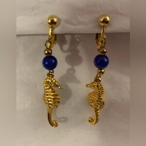 Gold toned seahorse and faux lapis lazuli blue bead dangle clip on earrings.