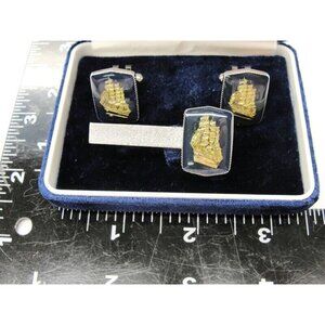 Gold Tone Ships Cufflinks & Neck Tie Clip Set Silver Tone Formal IOB Vintage