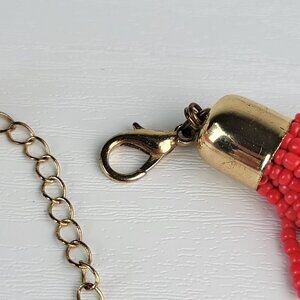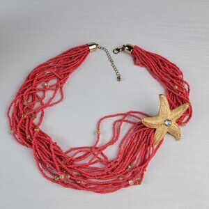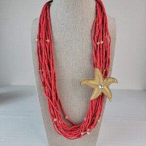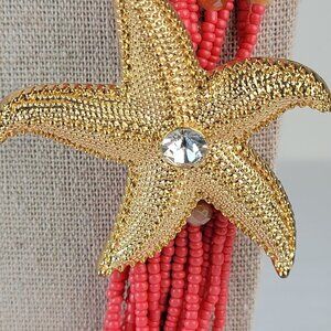 Gold Tone Starfish Charm Red Seed Bead Muti Strand Statement Necklace 25 Inch