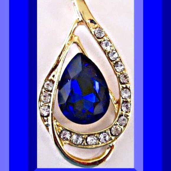 Gold In Color Tear Drop Design Necklace With Blue & Clear Crystals! Very Classy Great For Gift Giving Or For Yourself.