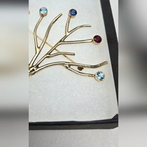 This Gold Tone Tree of Life Brooch Pin features twisted trunk branches with colorful stones, making it a perfect accessory for occasions like Christmas, anniversaries, or birthdays. The multicolor stones add a touch of beauty to the nature-themed design, with a main stone in blue surrounded by red and other colorful stones. The 2-inch brooch is signed by the brand Tree of Life and is made of stone set in a gold base metal, creating a unique and original piece of vintage-inspired jewelry for women who appreciate nature and beauty.