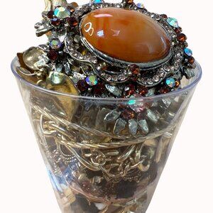 This 1lb lot includes a variety of wearable gold-tone jewelry pieces. Expect a mix of chains, brooches, and accents, including a stunning rhinestone brooch with an amber-colored center. Ideal for collectors or enthusiasts seeking versatile items for their collection or daily wear.