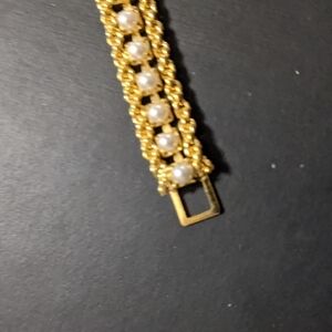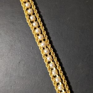 Gold Tone White Faux Pearl Statement Bracelet. 7.25" long.