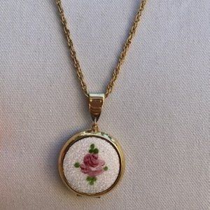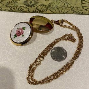 ❤️❤️Gold Tone White Flower Guilloche Large Enamel Locket NECKLACE