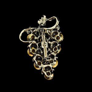 A vintage brooch and earrings set, designed to resemble a bunch of grapes on a vine. The set is composed of gold-toned metal and adorned with golden glass rhinestones.