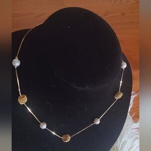 It has a gold toned chain faux Pearl accents. it is a perfect delicate accent necklace.