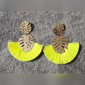 These striking earrings from Source Unknown feature a captivating combination of gold leaf-shaped studs and vibrant neon yellow tassels. The semi-circular fan design adds a modern flair, making them a standout accessory for any ensemble.