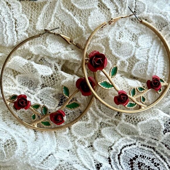 Gold Tone Roses Enamel Earrings, Approximately 2” Diameter, Good Condition