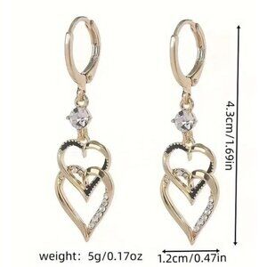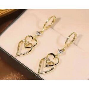 Elegant gold toned earrings featuring a double heart design adorned with rhinestones. Lightweight and secure lever back closure ensures comfort and style.
