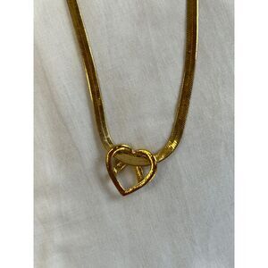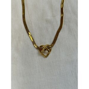 This is a gold toned necklace with a herringbone pattern on the chain. The heart shaped pendent has gems on one side of it and slides on the chain. I'm not sure of the maker. It is a pretty sturdy necklace. It could use cleaned up just a little bit, but there is nothing wrong with it and the clasp works just fine. The chain is 23 inches long.