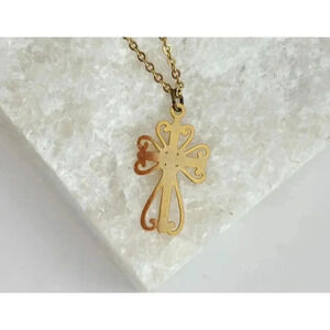 Beautiful and ornamental carved gold toned cross pendant necklace.