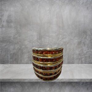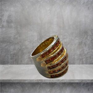 Anyone who loves jewelry will adore this stunning gold-toned ring with faux rubies. This eye-catching piece features alternating bands of gold metal and rows of radiant rubies, making it the perfect statement piece for any occasion. With its bold design and commanding presence, this ring is a must-have for those born in July or anyone looking to add a touch of glamour to their outfit. Elevate your look with this exquisite and timeless piece of jewelry.