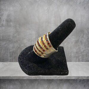 Anyone who loves jewelry will adore this stunning gold-toned ring with faux rubies. This eye-catching piece features alternating bands of gold metal and rows of radiant rubies, making it the perfect statement piece for any occasion. With its bold design and commanding presence, this ring is a must-have for those born in July or anyone looking to add a touch of glamour to their outfit. Elevate your look with this exquisite and timeless piece of jewelry.