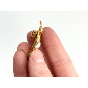 Lovely little gold toned brooch. The brooch is swirly and inspired by Art Nouveau styles. Accented with clear rhinestones. Also accented with an oval shaped egg. pearl is faux.
