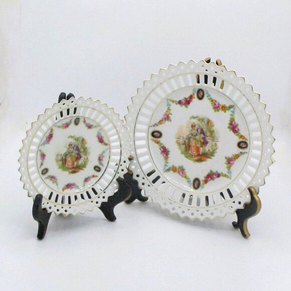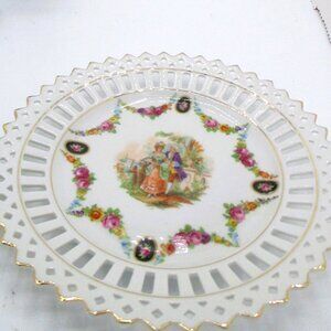 Gold Trimmed Reticlated Ceramic Plates Courting Couple Germany Set of