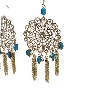 Gold & Turquoise Chandelier Earrings With Beaded Dangle & Fringe Design Bohemian