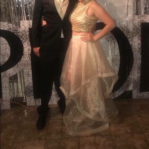 •Bottom is layered, sheer. Comes with a fitted solid colored skirt underneath. Floor length, no rips tears or stains.