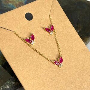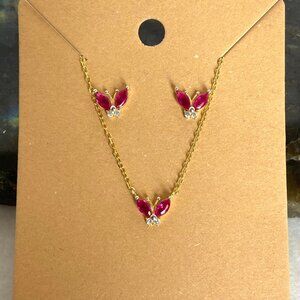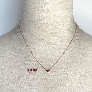 This very petite dainty butterfly necklace and stud earring set each with 2 prong set marquise ruby stones forming the butterfly wings with 2 small round colorless stones that are too small to test for gemstone vs CZ.