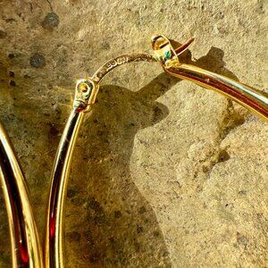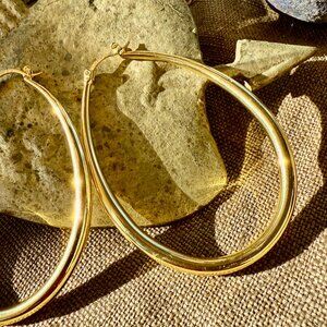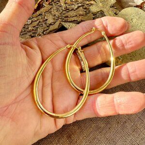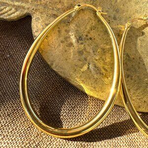 Gold vermeil sterling silver long oval hoop earrings. They are 2 1/4" long by 1 5/8" wide The tube is 2mm wide. Weight: 10.8 grams. Marked 925