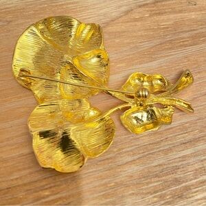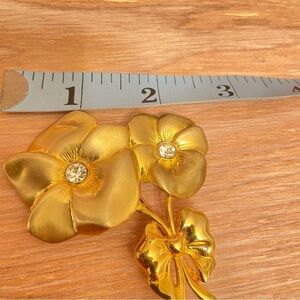 Gold Vintage Pronounced Size Floral and Faceted Stones with Decorative Bow Brooch. Gold color, with pin closure, center faceted clear stones, and a decorative bow at the bottom. Unbranded but vintage and in good condition.