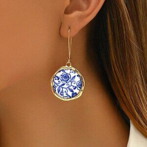 Gold Vintage Women's Luxurious And Porcelain Pattern Long Hook Earrings