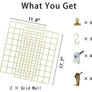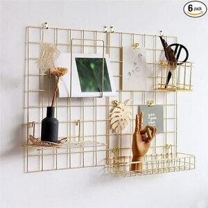 Gold Wall Grid Panel Set Photo Display Organizer with Hooks Clips 2 Pack