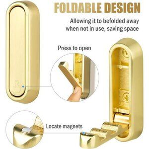 🧿【Elegant Appearance】 Features rounded corners and smooth surfaces with a sophisticated brushed gold finish that complements any room decor. These space-saving hooks fold flat against the wall, maintaining a clean look while staying ready for action