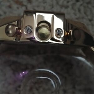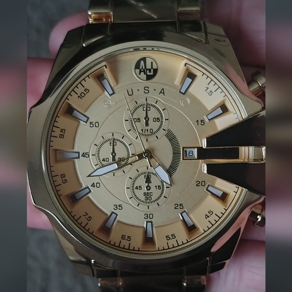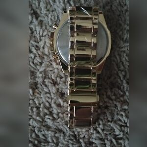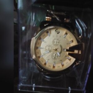 Gold Toned water proof stainless steel new watch, face is 2" big and band is over an inch wide, comes in box