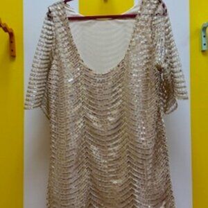 This Great Gatsby inspired dress is perfect for a themed event or just wowing the masses at a dinner party. A beautiful gold sequin with a wavy, scallop style hem and mid-sleeve with a bit of sheer to keep it feminine. Size L Hits at the knee from a non-smoking Home