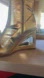 Shiny gold wedges with a unique cutout heel. Elevate your style effortlessly.