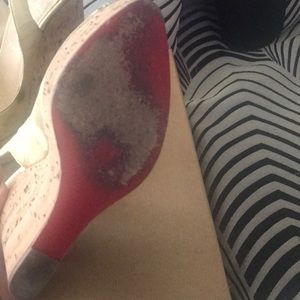 Red bottoms, five inch wedge. No box or duster bag. Sorry. I but I can’t find this box for this shoe. I think I got it in Las Vegas and didn’t pack the box in my luggage... some scuff marks on the shoe but are not visible when worn because they are on the inside. I’d say this wedge would fit a LOUB owner who wears 6-6.5