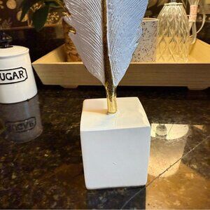 An elegant decorative piece featuring a gold and white feather design, perfect for enhancing the aesthetic of desks, shelves, or table displays.