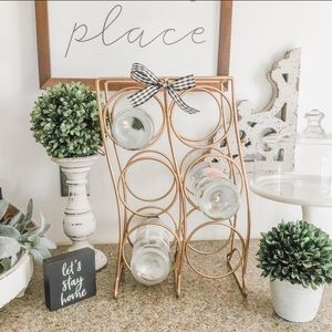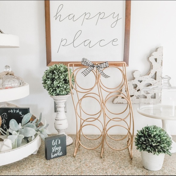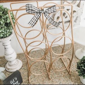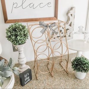 Pretty metallic gold wine rack, holds 6 bottles. Stands 16 inches tall and 10” wide at bottom. Beautiful condition! Bow can be removed if you prefer