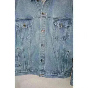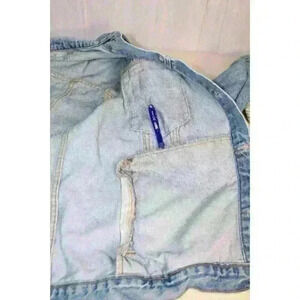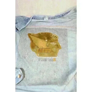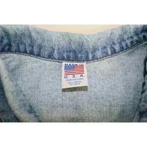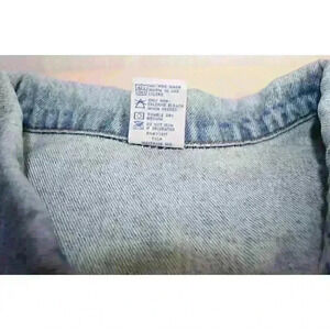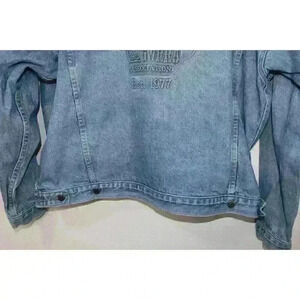 Arrives from a smoke free small Montana owned business. Pre washed per instructions. Gently worn, due to age there is some wearing of the inner decal on the back area inside the jacket. There is no wear issues with the denim fabrics. PTP 27 inches, length is 26 inches and sleeves are 22 inches.