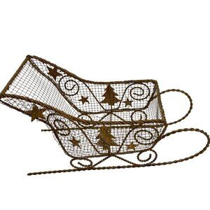 This gold wire sleigh tells a cozy holiday tale, adorned with tree and star accents. A charming centerpiece or festive addition to seasonal décor.