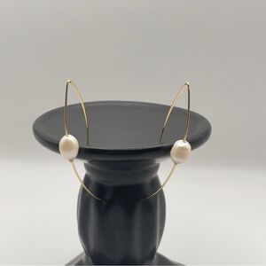 Elegant and modern, these gold-tone threader earrings feature lustrous freshwater pearls delicately set on sleek curved wire hooks. The long, minimalist design creates a graceful silhouette that adds sophistication to any outfit. Perfect for both everyday wear and special occasions.