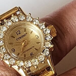 Vintage Cyrano Antimagnetic Gold-Tone and crystal Ring Watch with Hong Kong Movement - 1980s