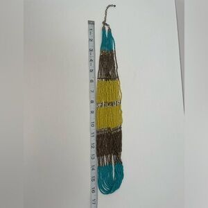This gorgeous statement necklace is made of Gold, Yellow, Brown and Teal Multi Strand Beads. The Necklace length is 30 inches + 3 inches of extension. In great condition.