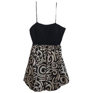 This elegant strapless bubble hem dress features a striking black and gold pattern, perfect for any occasion. Its stylish design offers a sophisticated look. Straps shown stays inside dress and only used for hanging. Silicone grips keep dress in place at the bust line. Size 14...Gently preloved...in great condition.