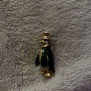 Elegant penguin brooch with gold and black accents. Perfect for adding a touch of whimsy to any outfit.
