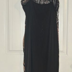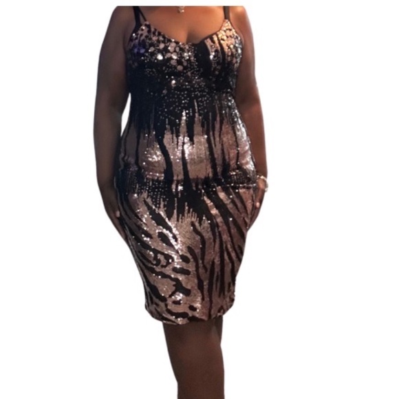 Get ready for compliments with this spaghetti strapped, sequins party dress. Sequins is on the front of the dress only. The back is very sheer, material is see through. Dress does not have size tag. Dress comes below knee length on height 5’4. Very Stretchy.