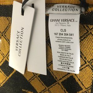Gold and Black Versace Collection scarf. New, in original packaging, elegantly woven but lightweight for all seasons use. Has a luxury feel and look. Would look great for male or female. 17 inches by 37 inches long. This is a thousand dollar Versace scarf and my very last one. I have lowered the price several times and cannot go less than $69.00. This is much less than I paid for it. This is a steal at that price and would make a GREAT Christmas or birthday gift for either sex.
