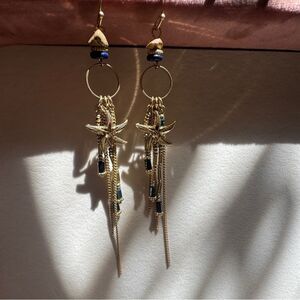 Elegant gold and blue dangle earrings featuring starfish charms. Perfect for adding a touch of ocean-inspired style to any outfit.