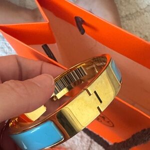 Elevate your style with the Clic H Bracelet. Featuring a stunning gold and blue design, this accessory adds a touch of luxury to any outfit. Perfect for any occasion. worn maybe 3 times. just don’t wear it enough. comes with everything in the picture. bag, box, tag etc. (perfect gift before holidays) no returns.