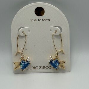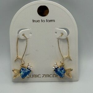 Elegant gold fish earrings with stunning blue cubic zirconia accents. Perfect for adding a touch of whimsy to any outfit.