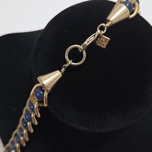 Beautiful Gold tone link necklace with dainty chain threaded through round blue beads