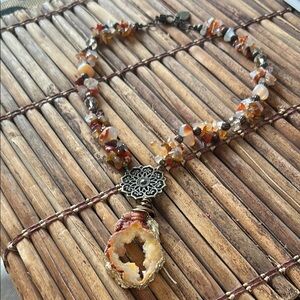 This exquisite necklace showcases a druzy agate with a natural open crystal center. The outer coloration (reds, yellows, oranges harmonious blend of brown and gold tones, highlighted by a captivating crystal pendant. The intricate design and natural hues. Key features: