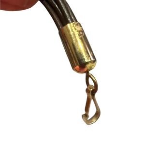 A striking blend of rugged and refined, this bracelet features multiple strands of small black leather straps , accented with gleaming goldtone. A captivating interlocking crescent moon design, perhaps as a clasp or a central focal point, adds a touch of celestial beauty and symbolism, evoking themes of intuition, growth, and new beginnings. It's a perfect vintage accessory with a touch of cosmic magic.