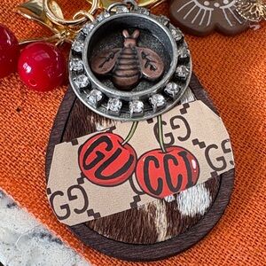 Elegant gold and brown charm keychain featuring floral and butterfly designs. Perfect for adding a touch of style to your accessories this is gorgeous cherries and more